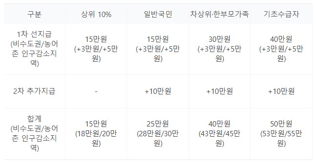 • 1차 : 전 국민에게 1인당 15만원(차상위 30만원, 기초 40만원) 우선 지급, 비수도권지역은 1인당 3만원 추가 지원, 농어촌 인구감소지역은 1인당 5만원 추가 지원