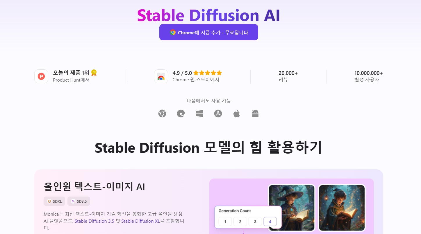 Stable Diffusion은 오픈 소스 기반의 이미지 생성 도구로, 사용자에게 높은 수준의 커스터마이즈와 제어 기능을 제공합니다. 무료로 사용할 수 있으며, 로컬 컴퓨터에 설치하여 사용할 수 있습니다.